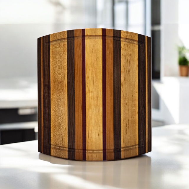 Small 14″x12″x1″ thick. Harwood edge grain cutting board . The 4 woods used are Maple, Cherry, Walnut and Purpleheart accents. Style P1