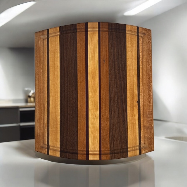 Small 13 1/2″x11 1/2″x1″ thick. Harwood edge grain cutting board . The 4 woods used are Maple, Cherry, Walnut and Purpleheart accents. Style P2